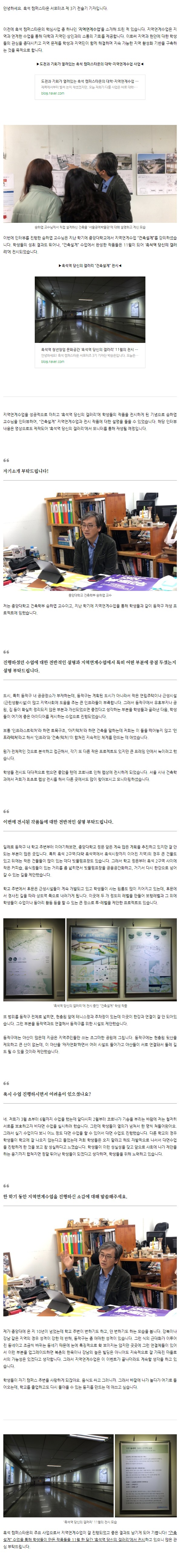 [중앙대/캠퍼스타운] [송하엽 교수 인터뷰] 지역연계수업 “건축설계” 성공적 마무리 후, ‘흑석역 당신의 갤러리’ 전시까지!(20.11.13) - 블로그