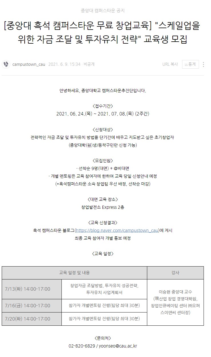 [중앙대 흑석 캠퍼스타운 무료 창업교육] "스케일업을 위한 자금 조달 및 투자유치 전략" 교육생 모집