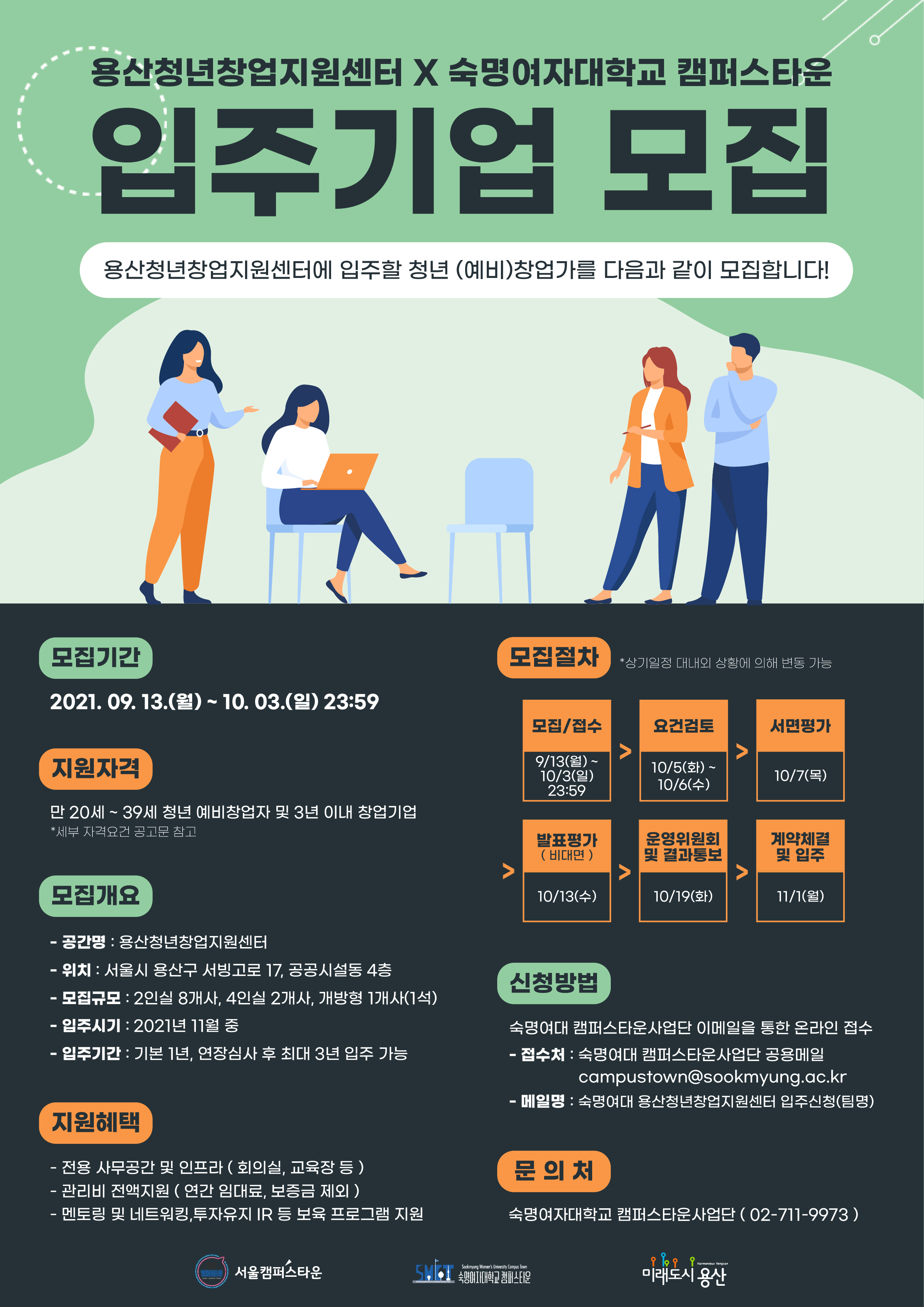 모집자격 요건 및 선정절차 등 세부내용은 숙명여대 캠퍼스타운사업단 홈페이지의 공지사항 게시판을 참고하시기 바랍니다.