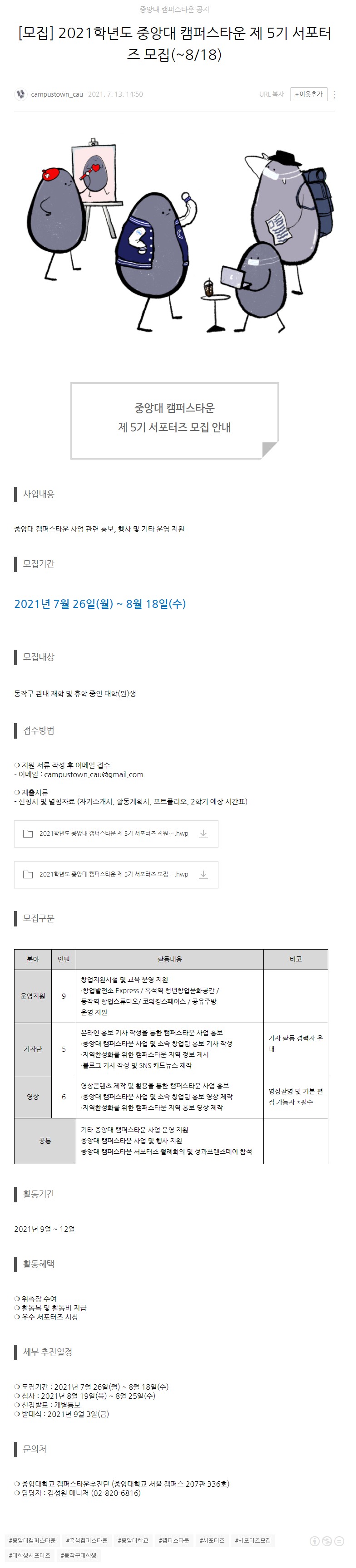 [모집] 2021학년도 중앙대 캠퍼스타운 제5기 서포터즈 모집(~8/18)