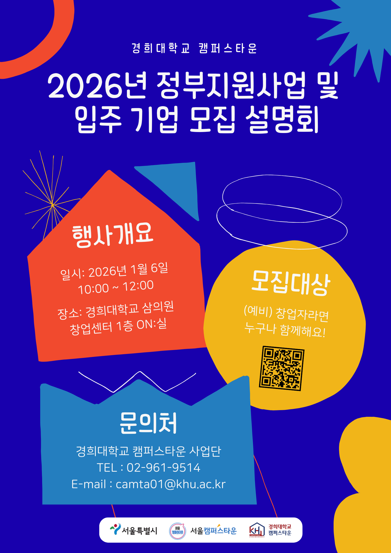 본 설명회에서는 ▲ 2026년 정부지원사업 로드맵 ▲ 사업 단계별 지원 전략 ▲ 사업계획서 작성 시 주요 평가 포인트 및 실무 팁 ▲ 경희대학교 캠퍼스타운 입주기업 모집 및 선발 절차 등을 중심으로 설명할 예정입니다.