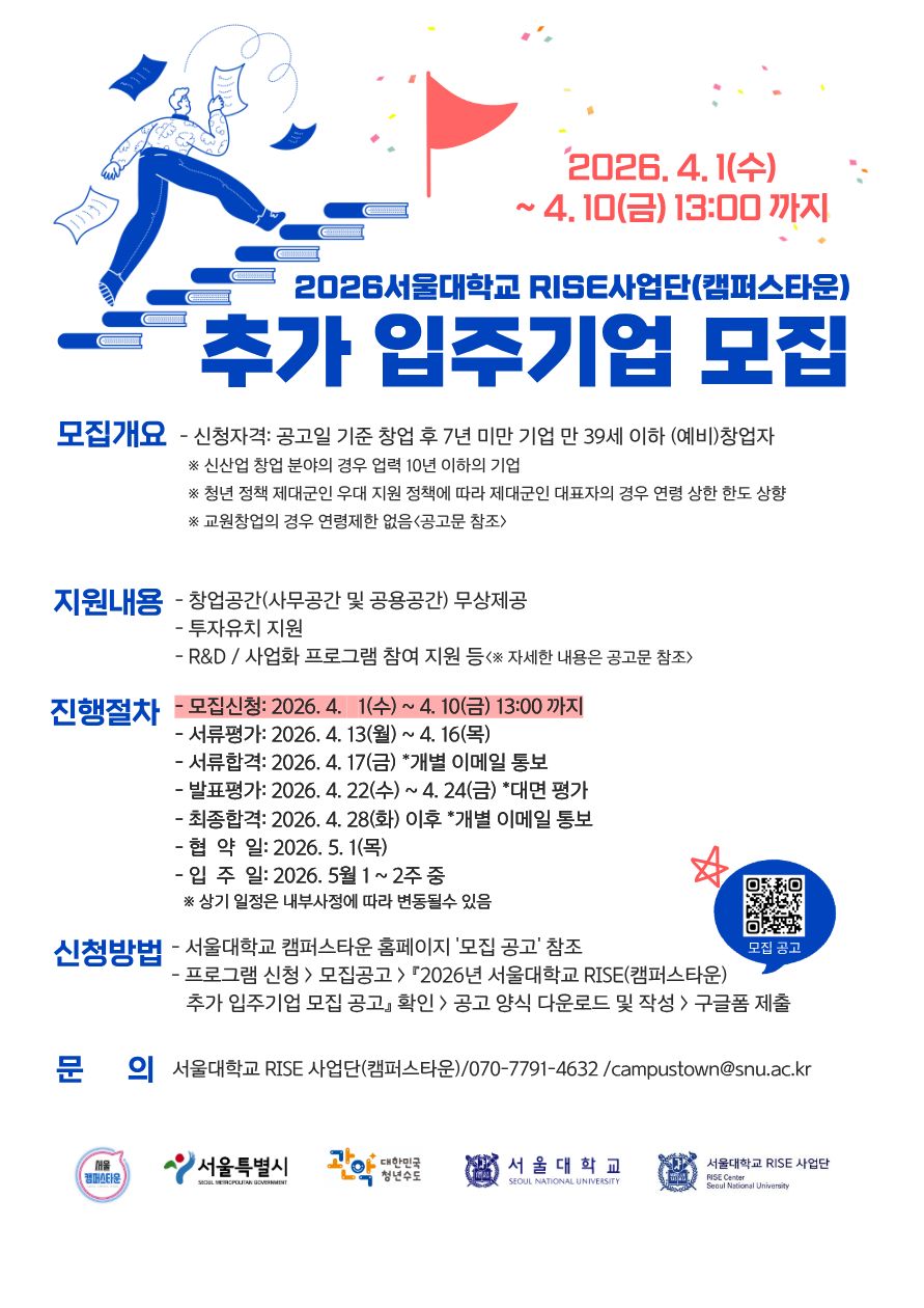 서울대학교 캠퍼스타운은 글로벌 성장 가능성이 있는 혁신 기술기반 창업기업을 발굴 및 육성하고자 「2026년 서울대학교 RISE사업단(캠퍼스타운) 추가 신규입주기업 모집」을