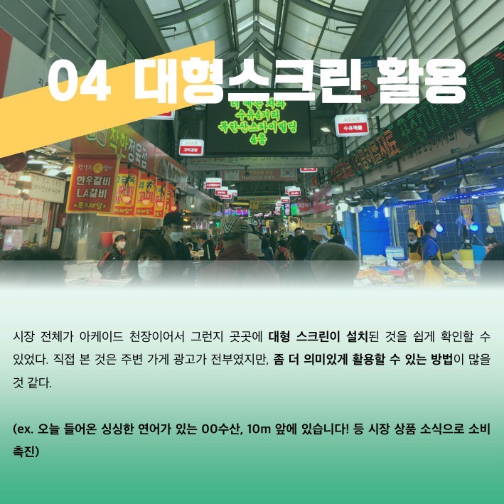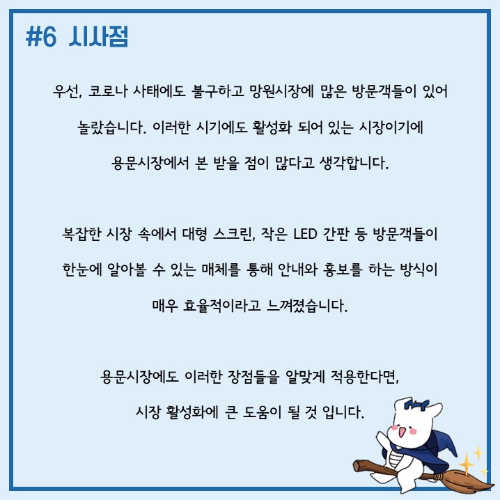 탐방 결과, 용문시장에 적용해보면 좋을 아이디어, 시사점이 많이 도출할 수 있었습니다