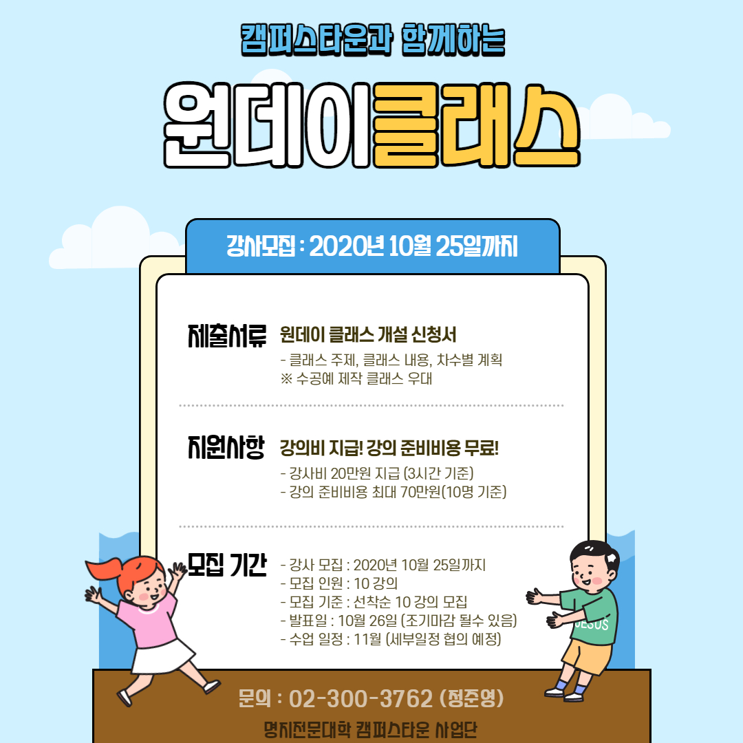 명지전문대학 캠퍼스타운 사업단 <원데이클래스>의 강사를 모집합니다.