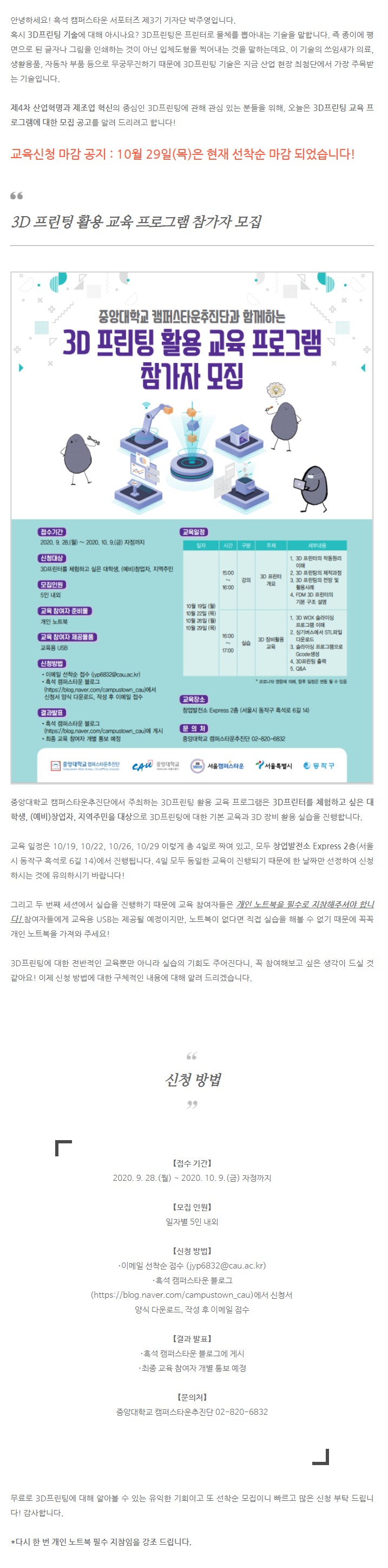 [중앙대/캠퍼스타운] 3D프린팅 활용 교육 프로그램 참가자 모집 (20.09.24) - 블로그